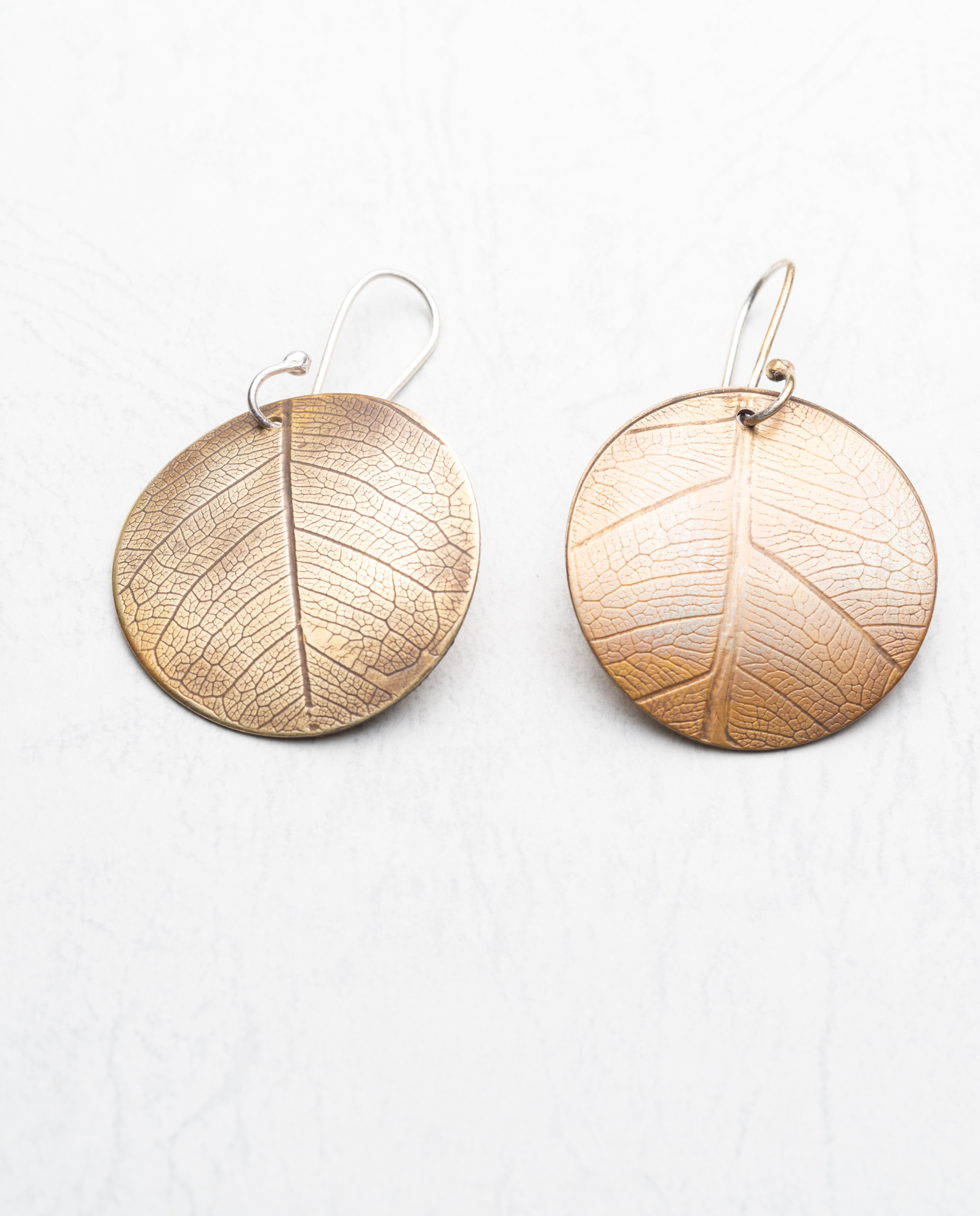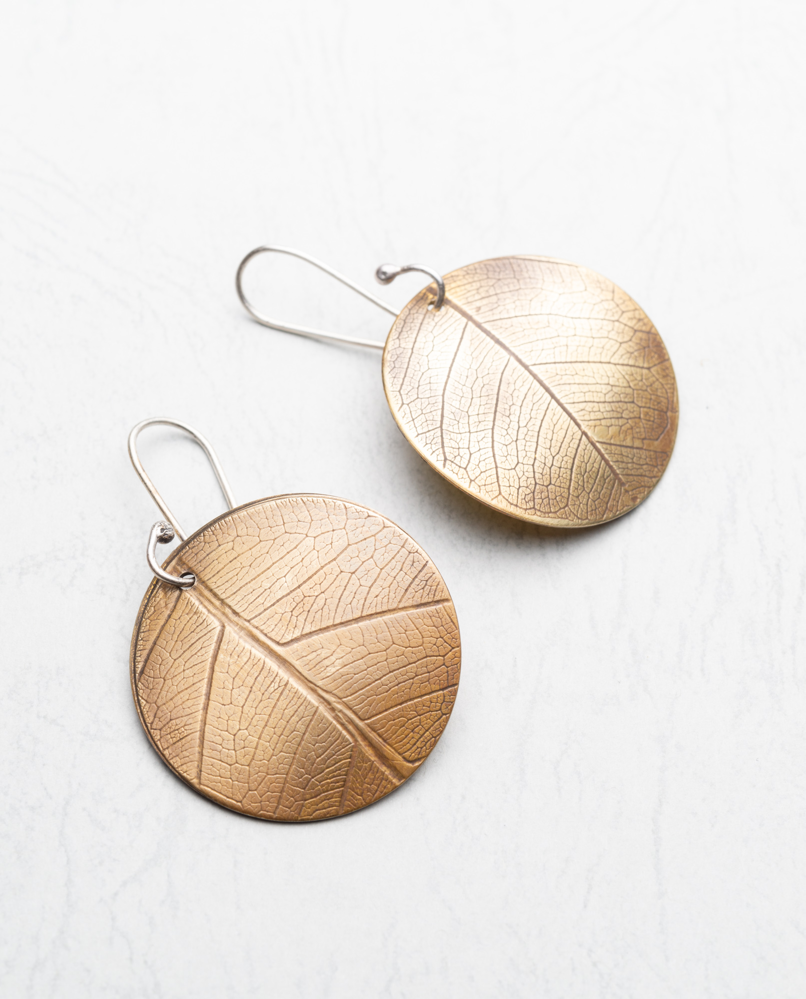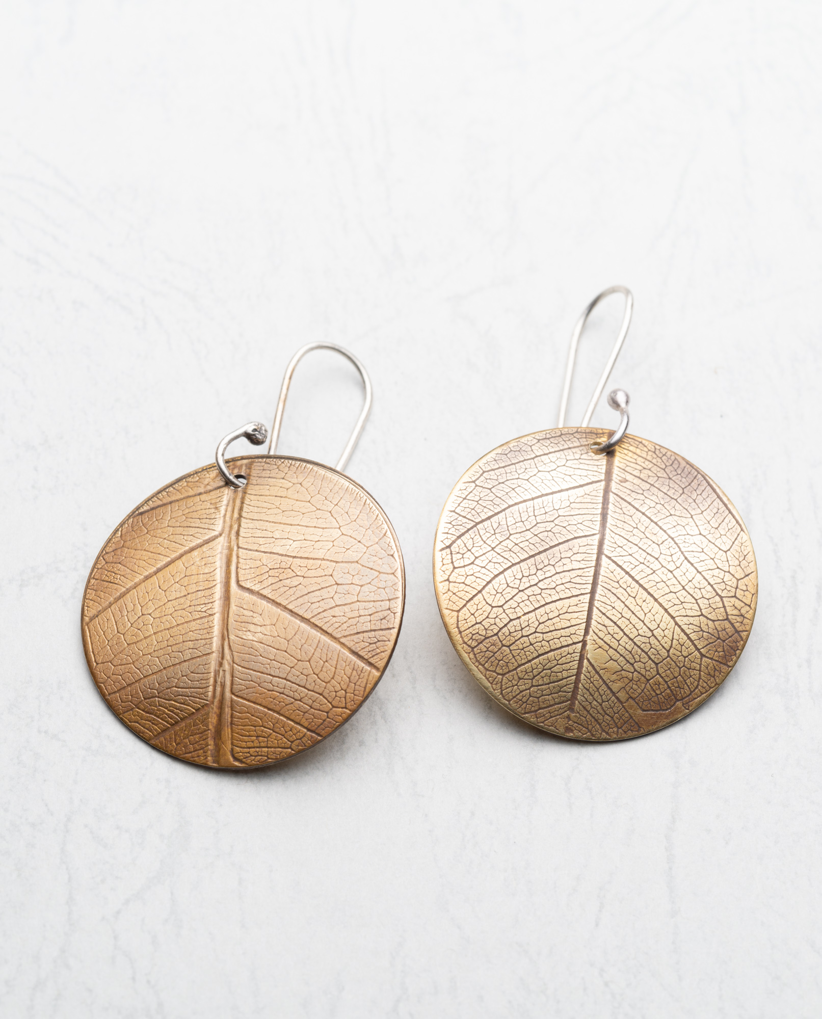 Brass and sterling silver circular leaf-patterned earrings 2.5cm diameter. Sterling Silver ear wire. Lightly patinated