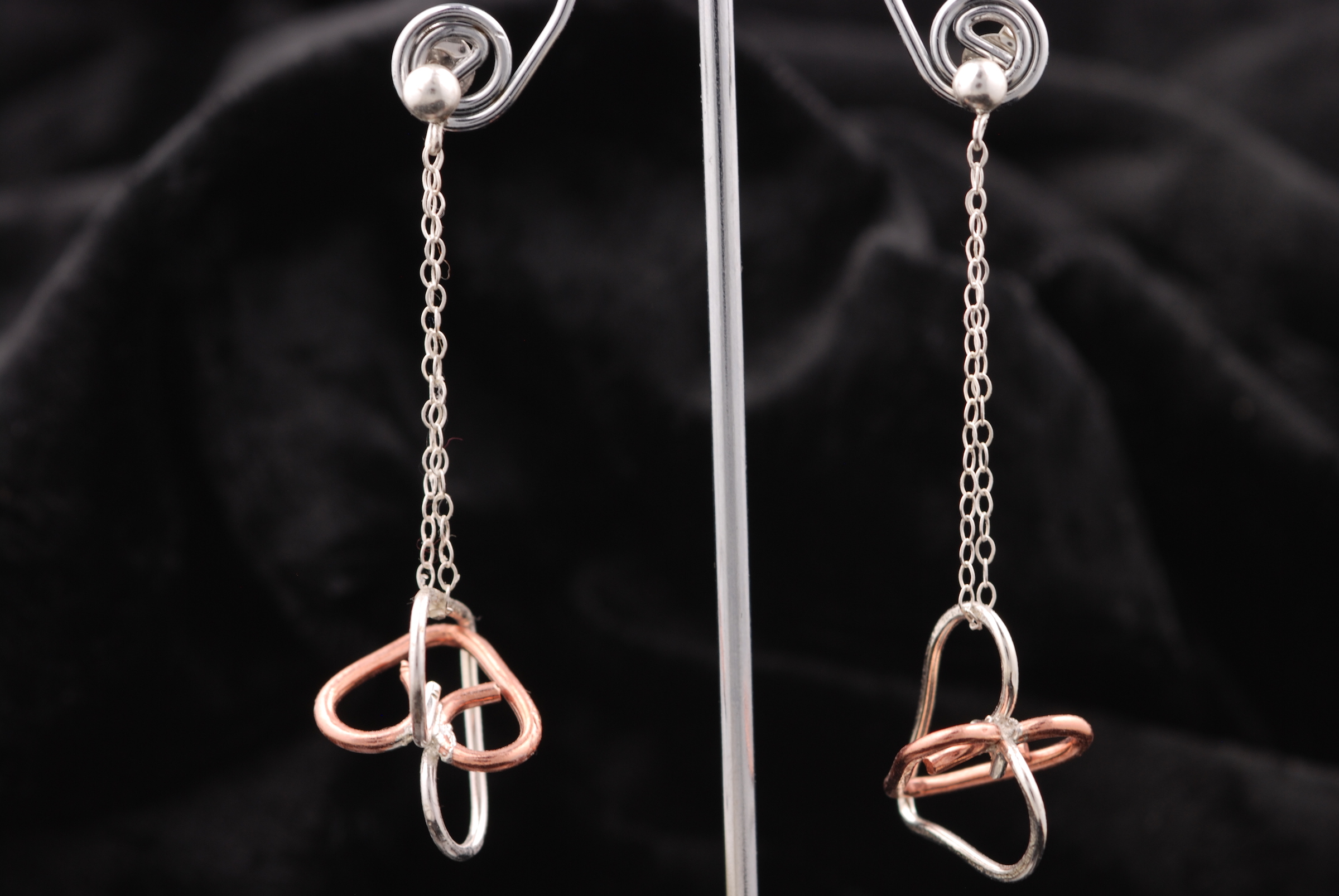 Sterling Silver/Copper Earring – ‘Entwined Hearts’ – Posts – Double Sterling Silver Chains