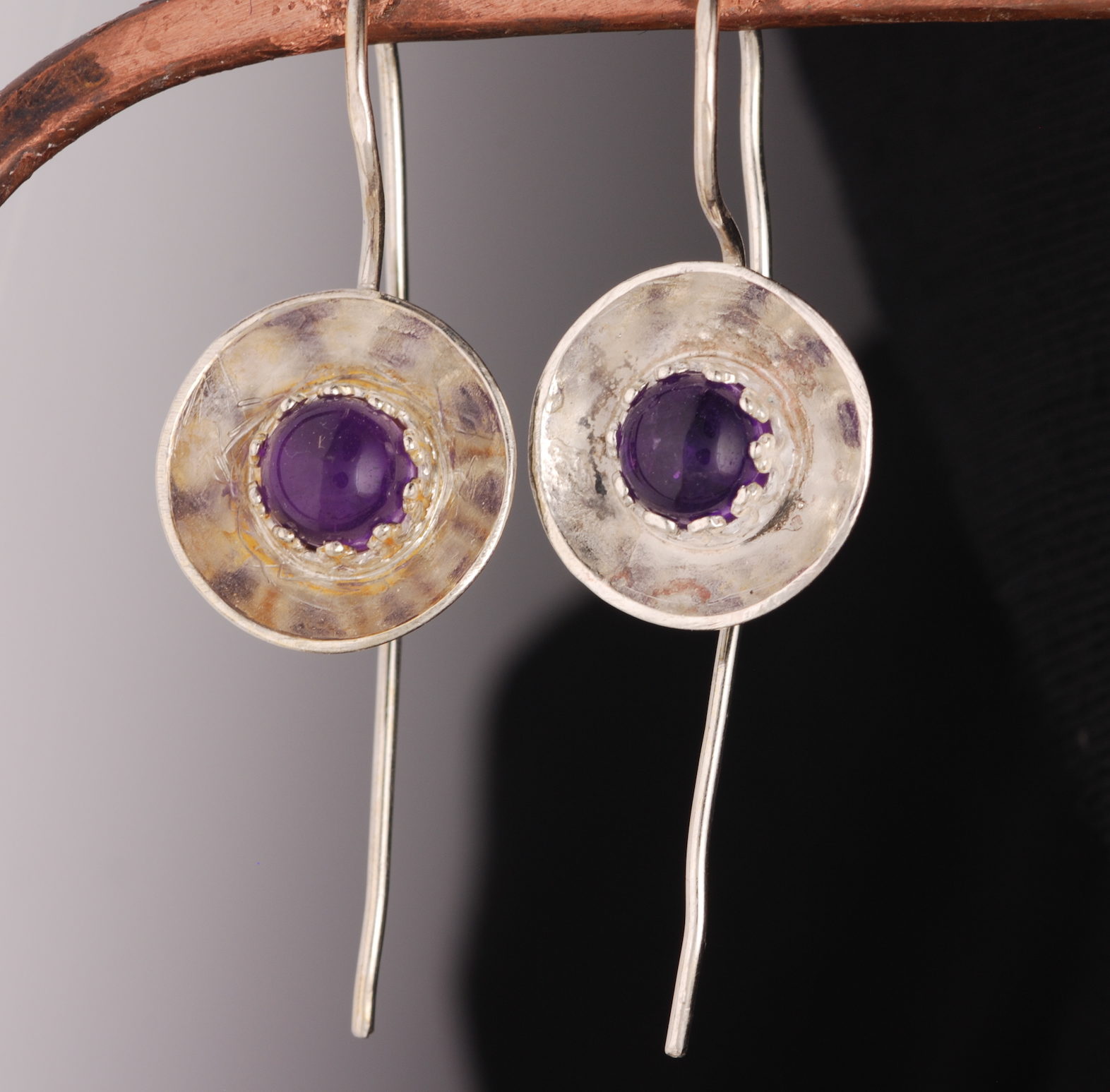 Amethyst Cabochon Bezel in a cup. .9mm Sterling Silver ear wire for strength.