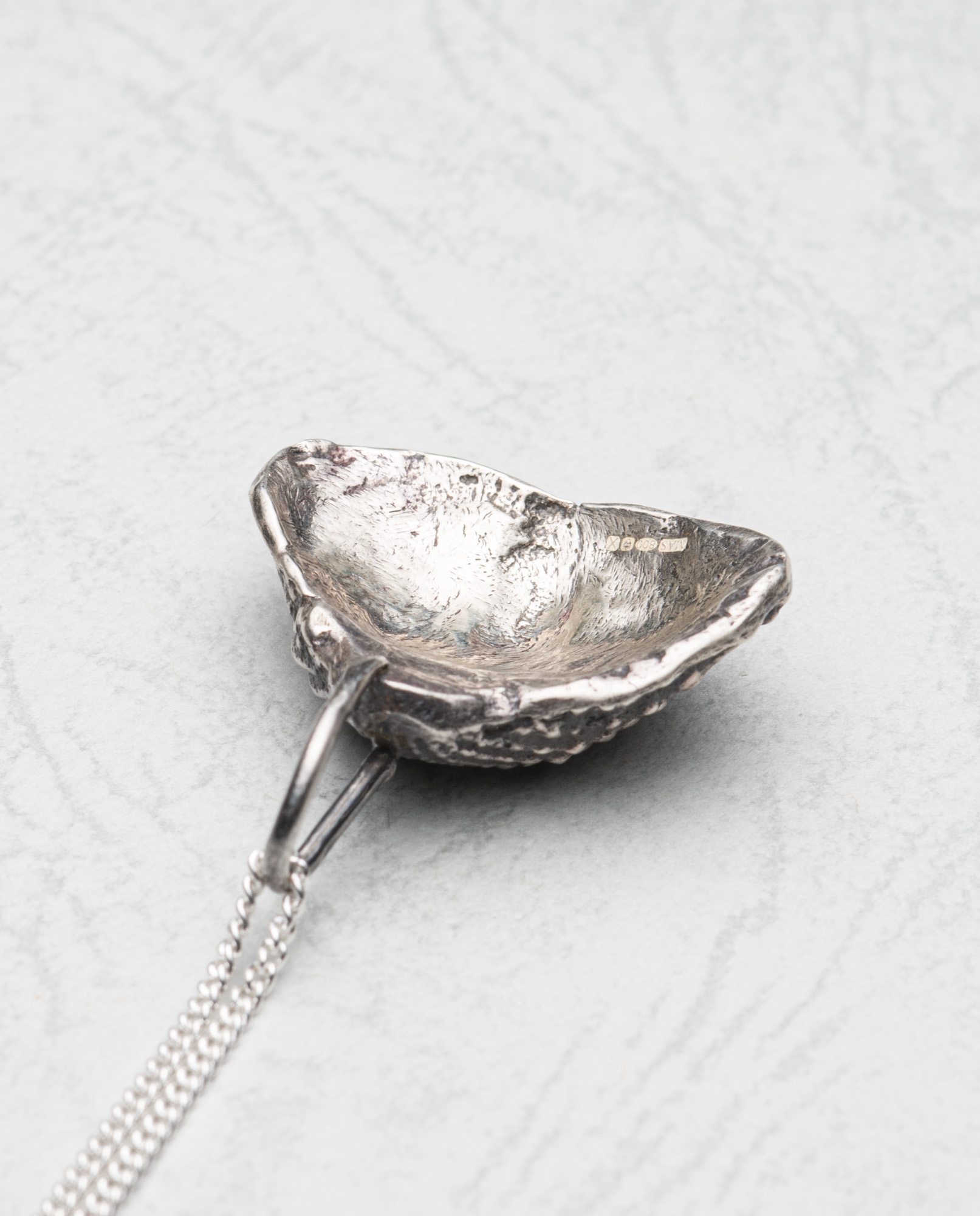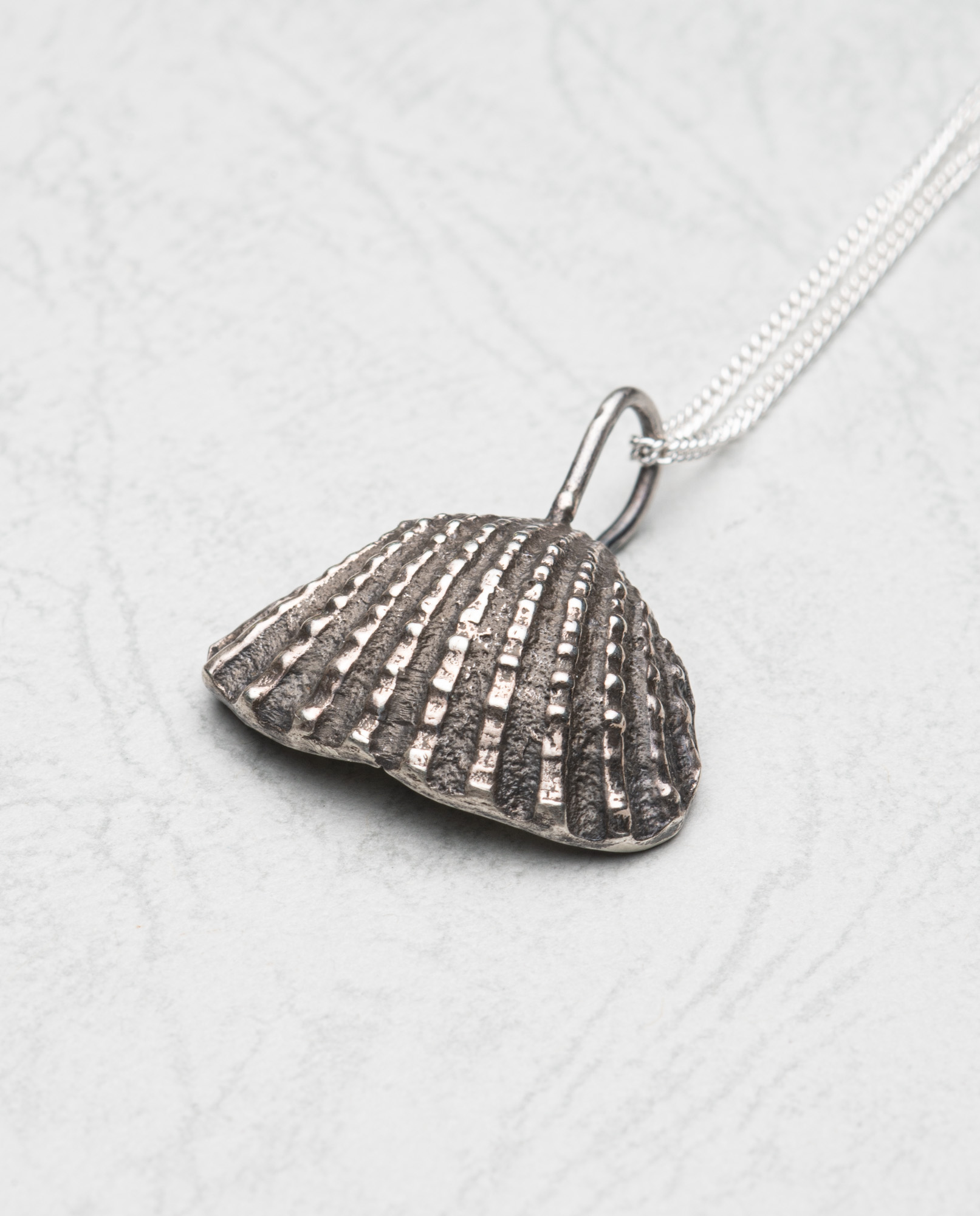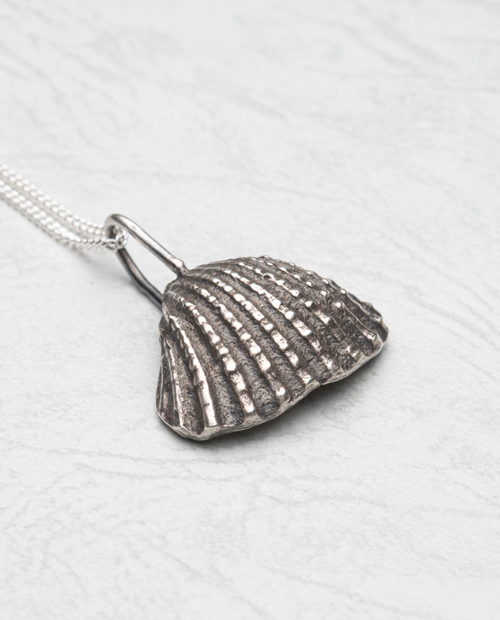 Darkened shell cast in sterling silver (11g) hallmarked with sterling silver chain.