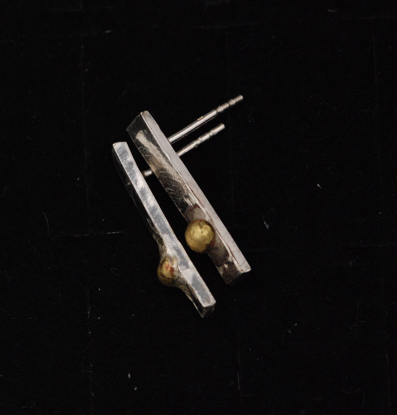 Sterling Silver Post Earrings – ‘Hammered Slim Bar with Brass Ball’